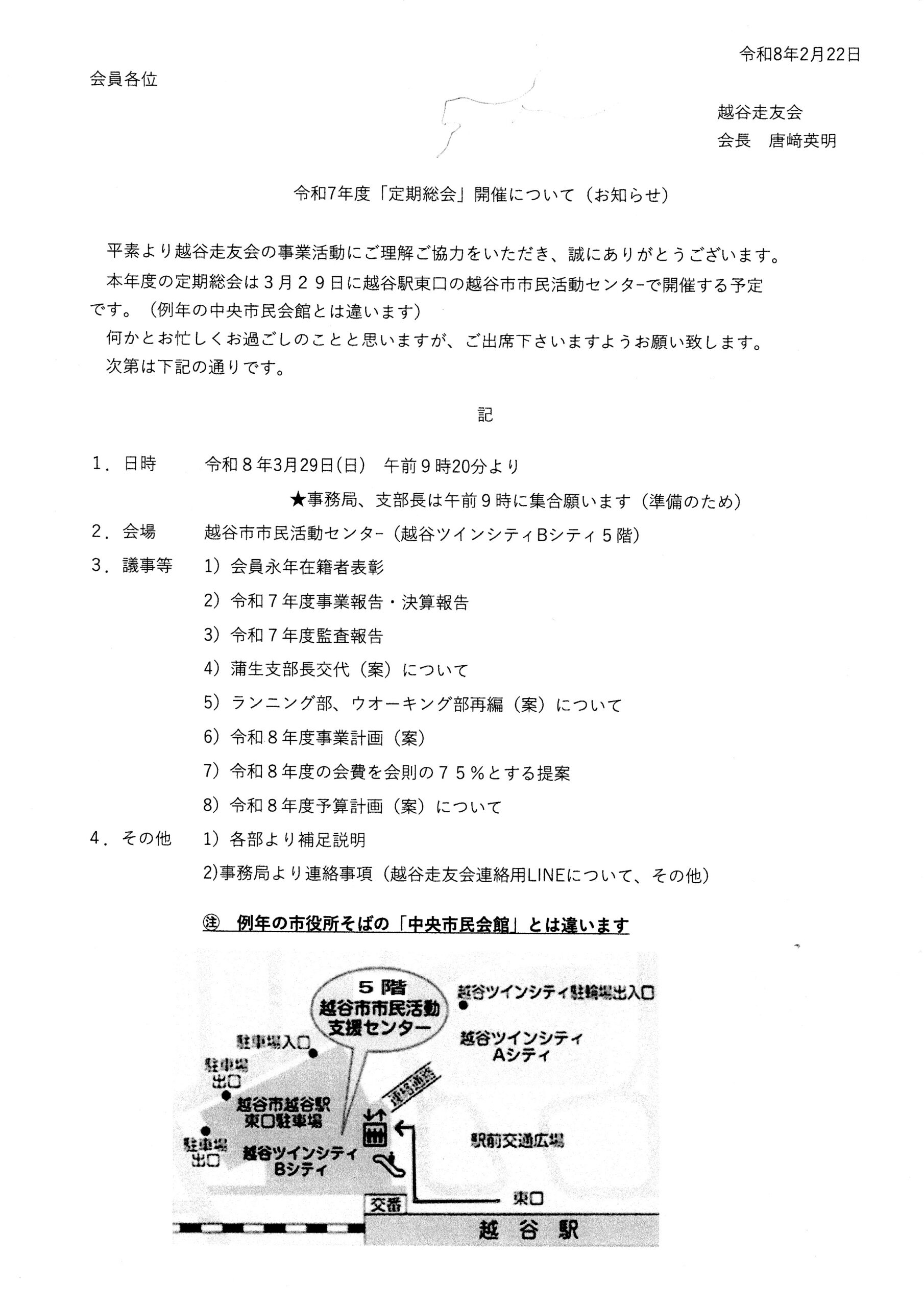 令和7年3月30日に越谷市中央市民会館にて「越谷走友会 令和6年度定期総会」が開催され会員77名中49名の参加がありました。